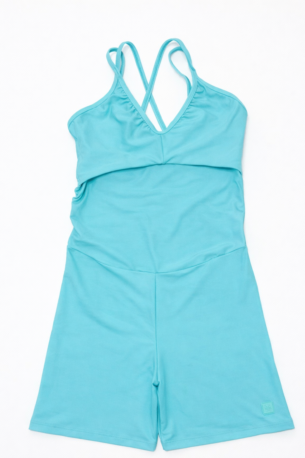 Macaquinho DLK com um design moderno, destaca-se pelo recorte frontal subtil e pelas costas abertas com alças cruzadas, que garantem um ajuste firme e um visual diferenciado.